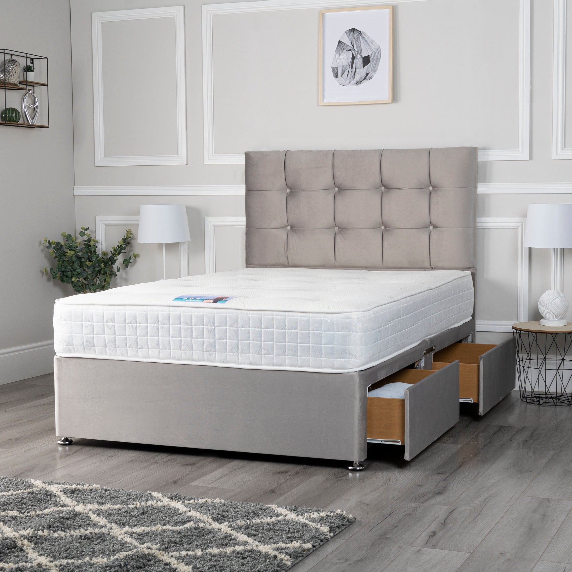 The base is ready built for easy assembly, it comes with chrome gliders and link bars on each side to attach the base together. This divan bed is supplied with a floor standing headboard.