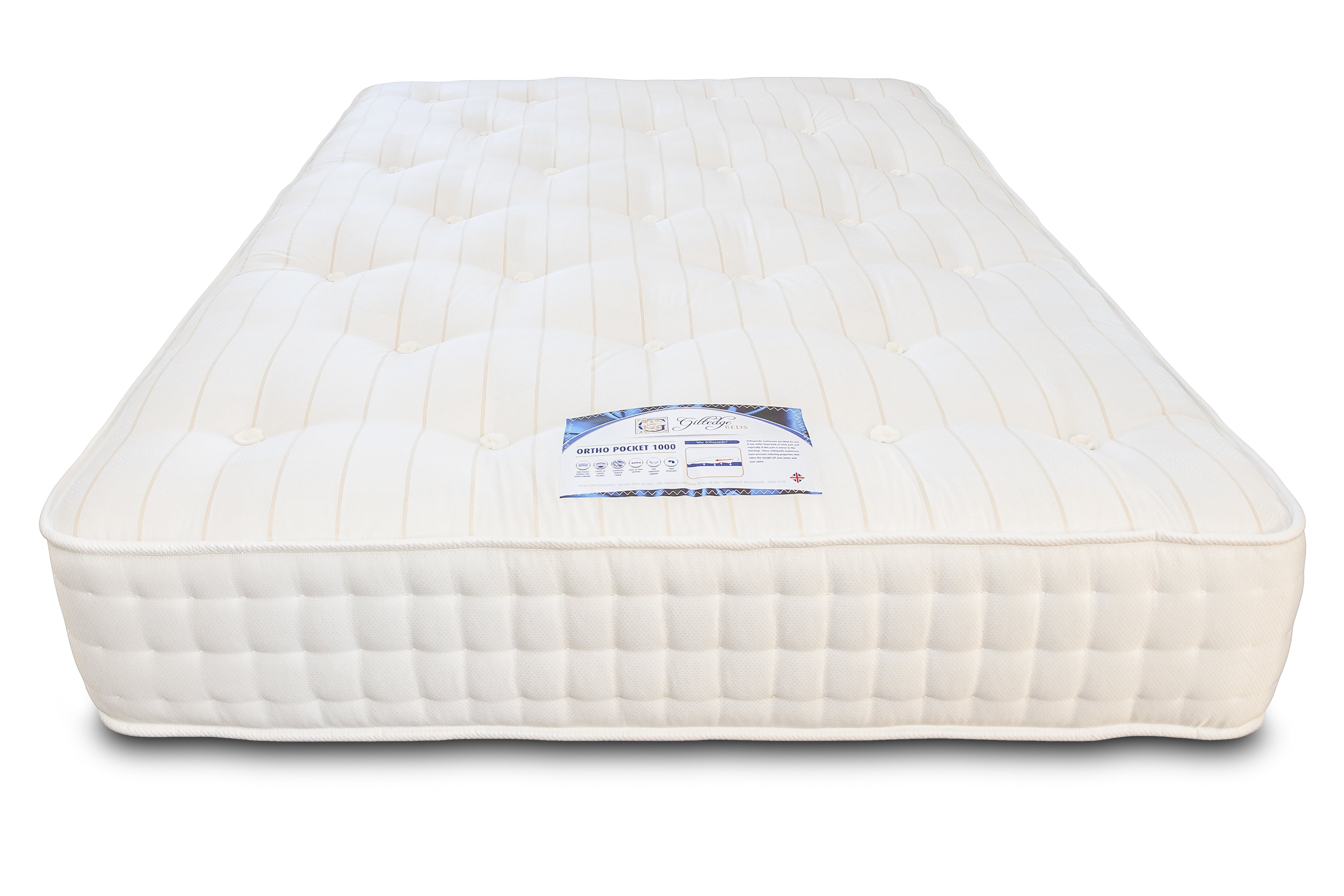 The Ortho Pocket 1000 is a medium to firm tension mattress. Hand tufted 1000 pocket sprung mattress with layers of luxury fillings and covered in a high quality damask fabric. Edge to Edge support providing you with an undisturbed nights sleep. Made in the UK by skilled craftsmen. Comfort: firm