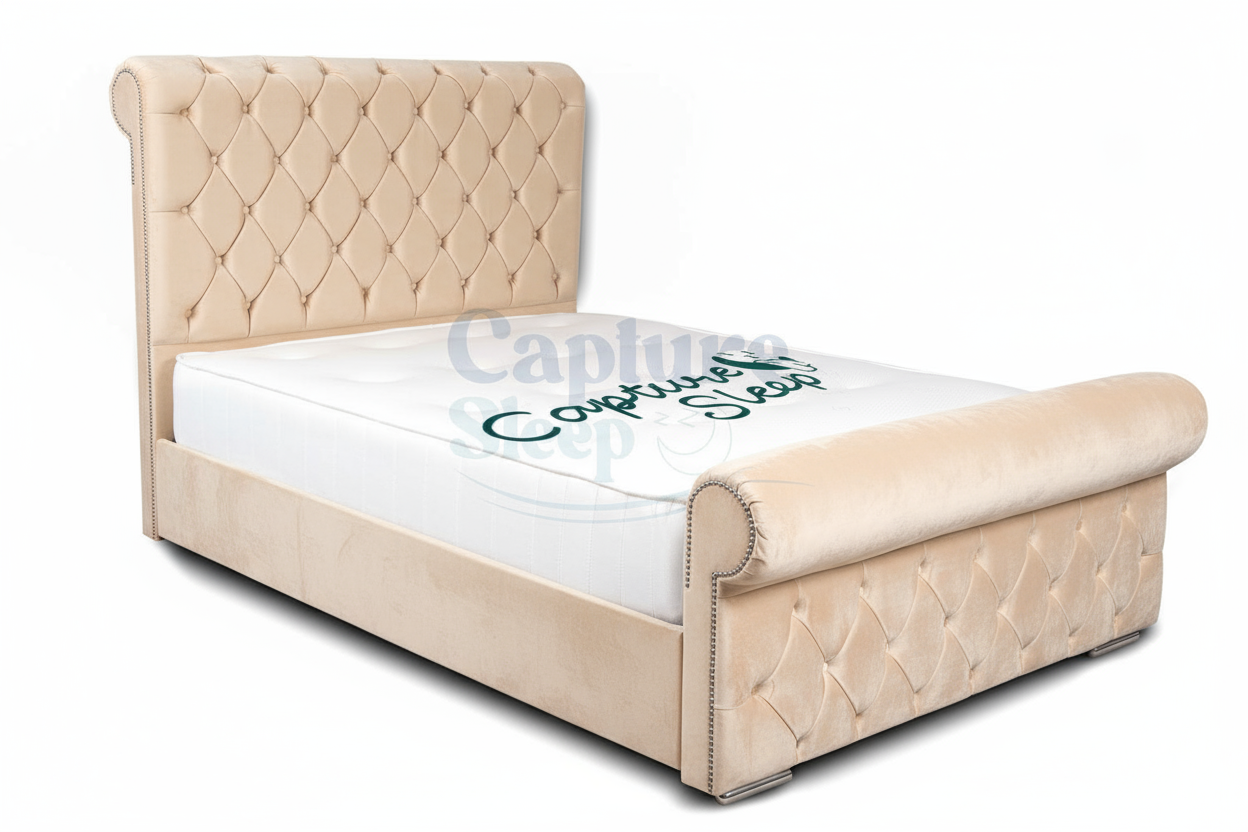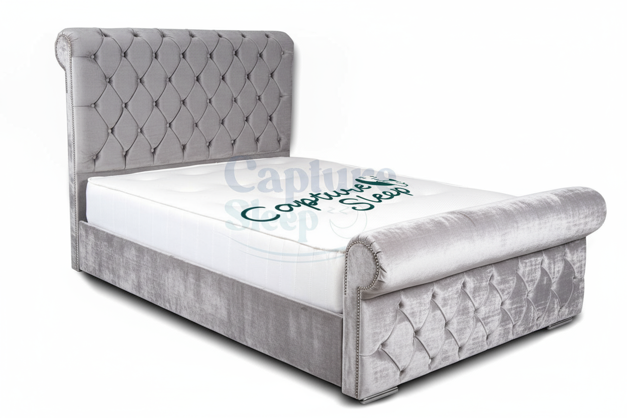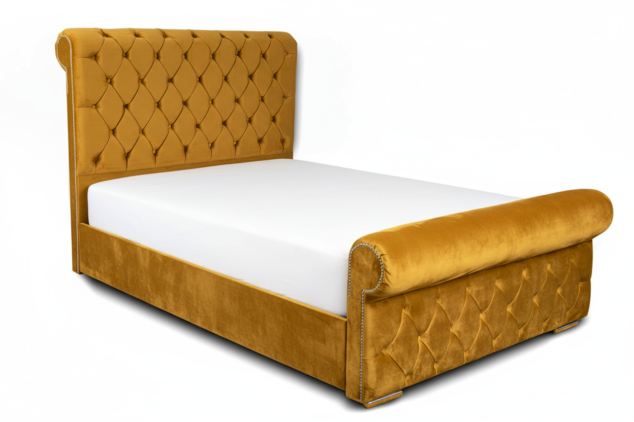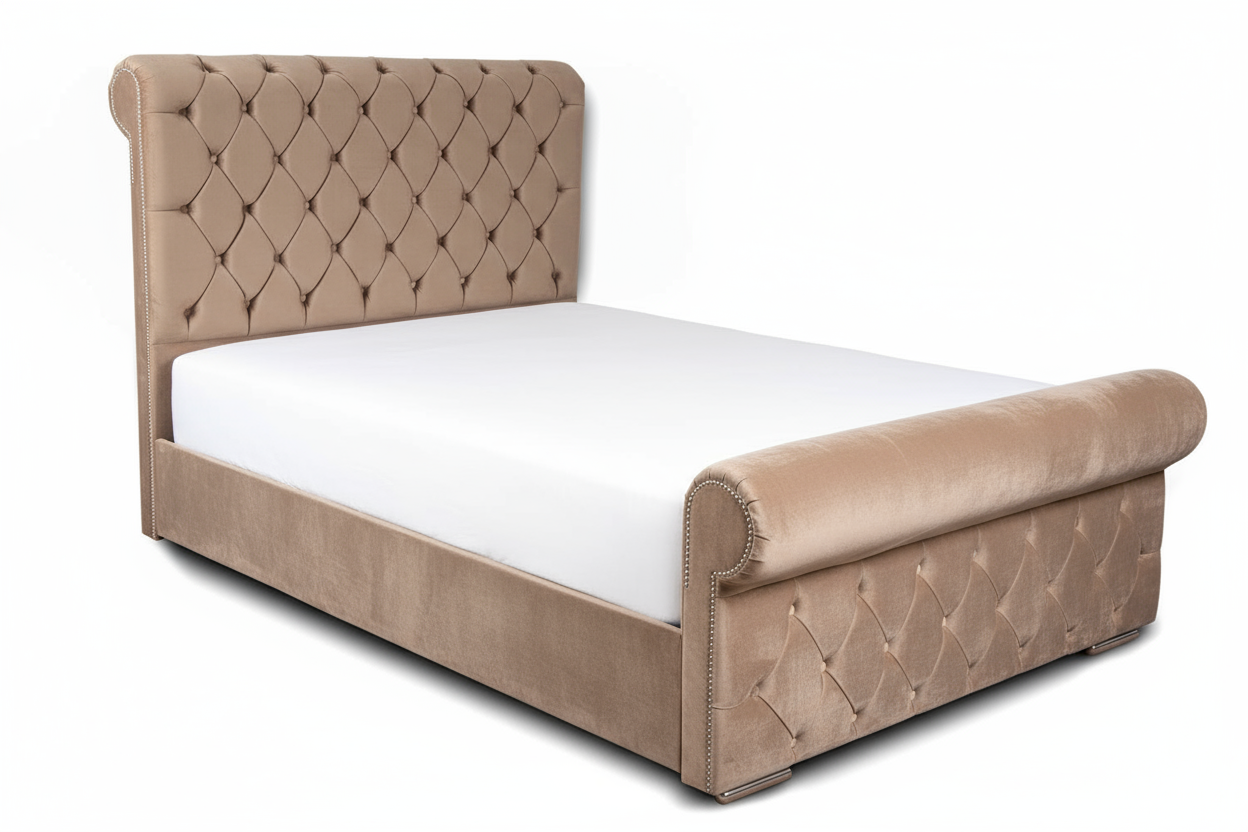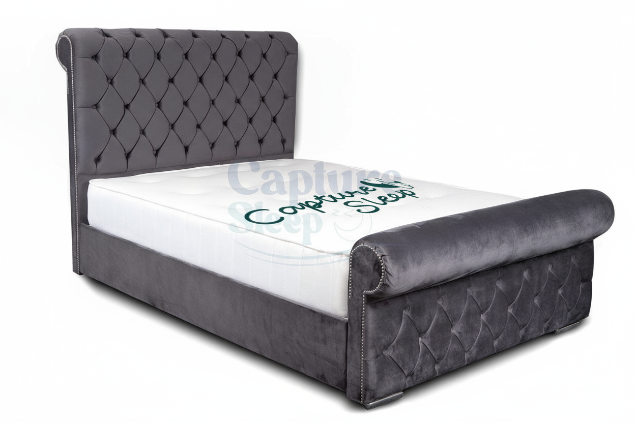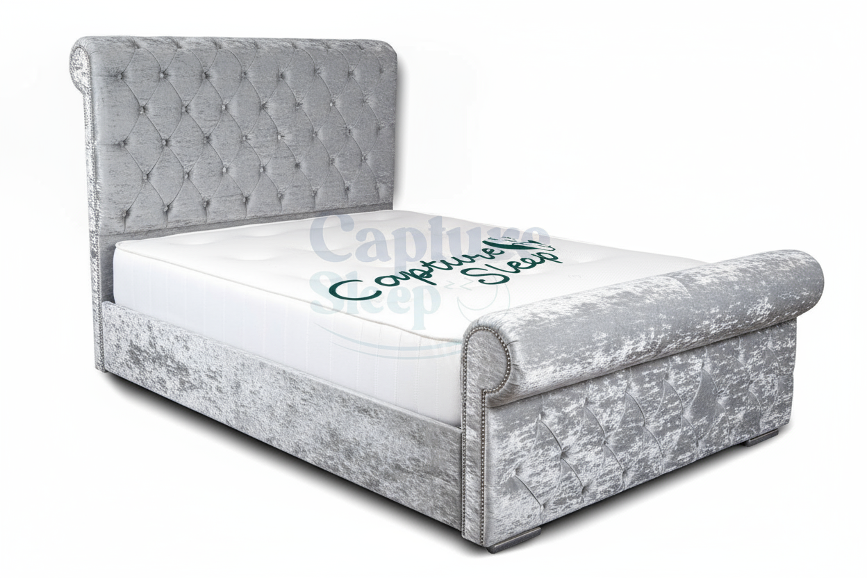 The Ellis Sleigh Bed Frame features a sleigh design with a scrolled headboard and upholstered footboard along with button tufting. This bed frame is available in a wide range of fabrics.