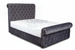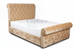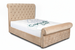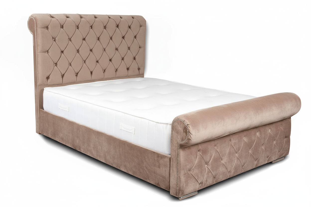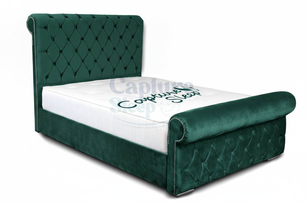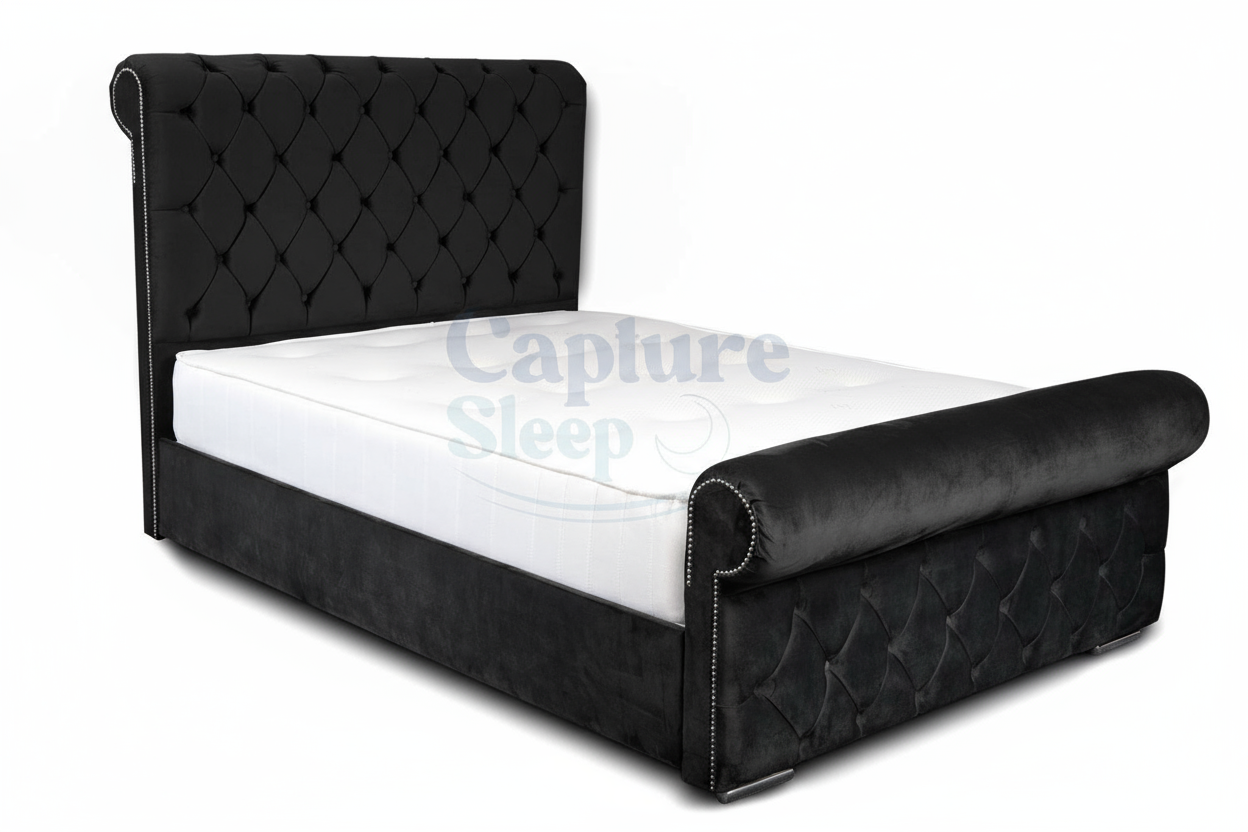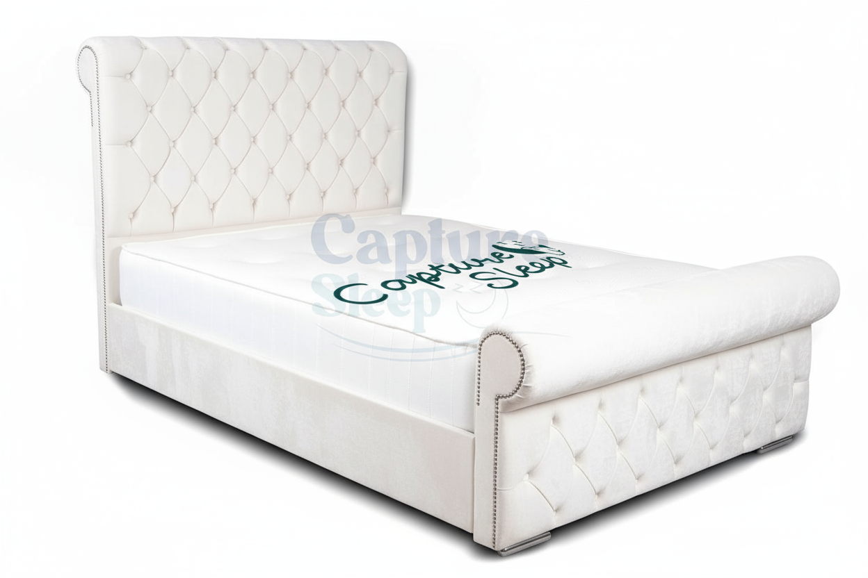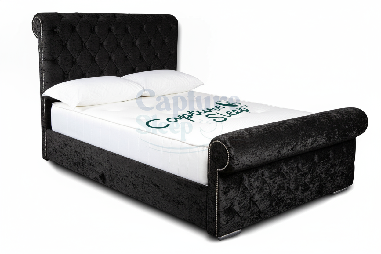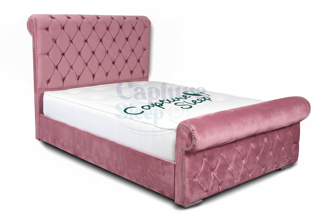 The Ellis Sleigh Bed Frame features a sleigh design with a scrolled headboard and upholstered footboard along with button tufting. This bed frame is available in a wide range of fabrics.