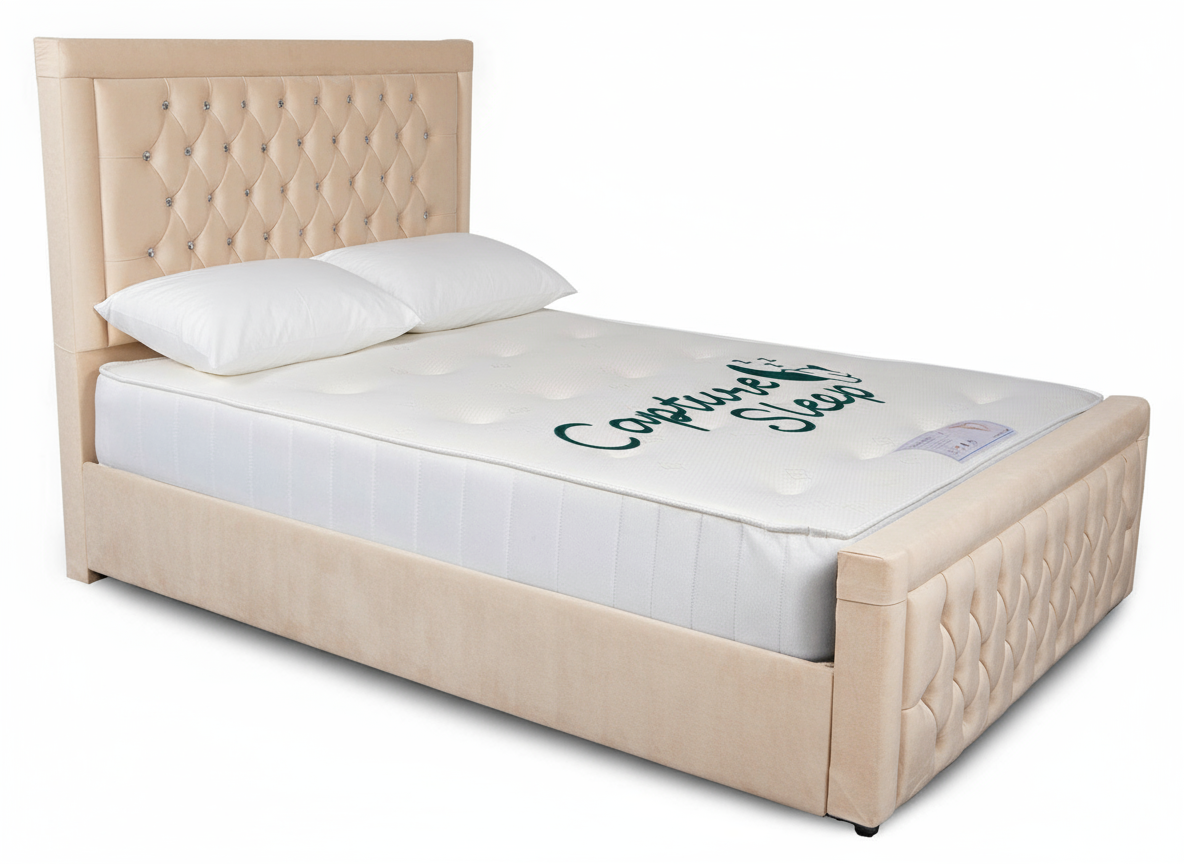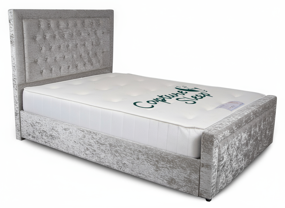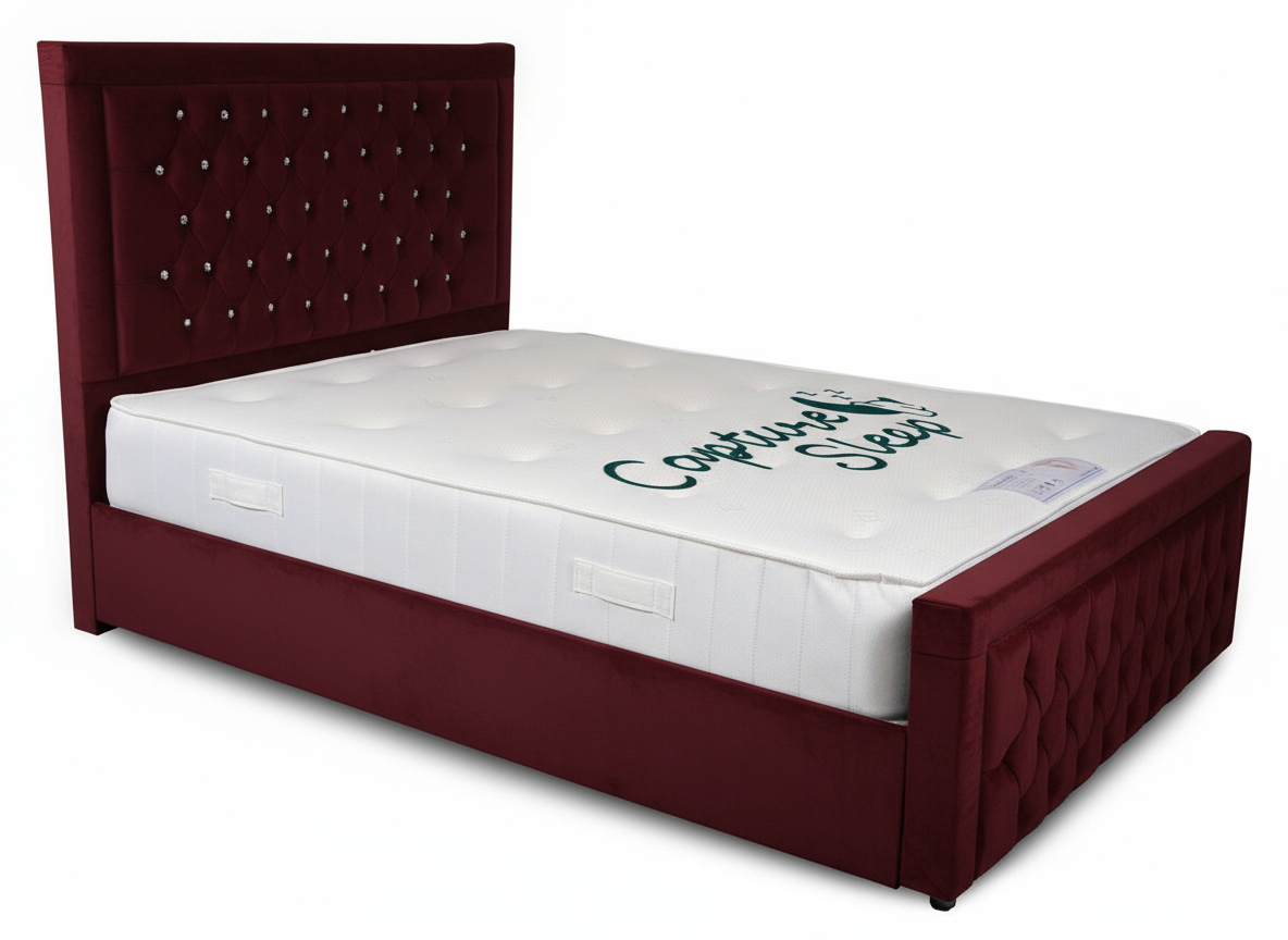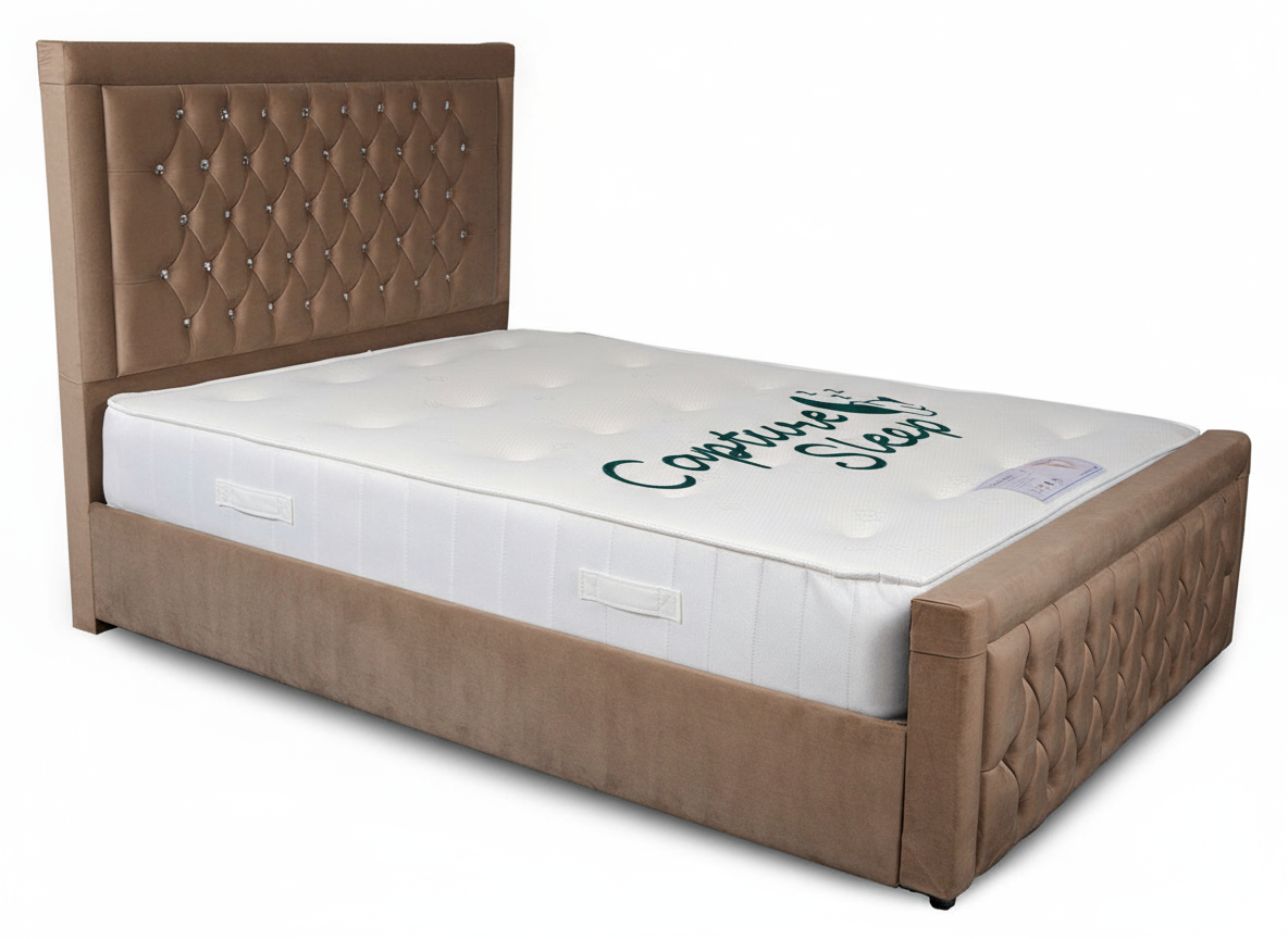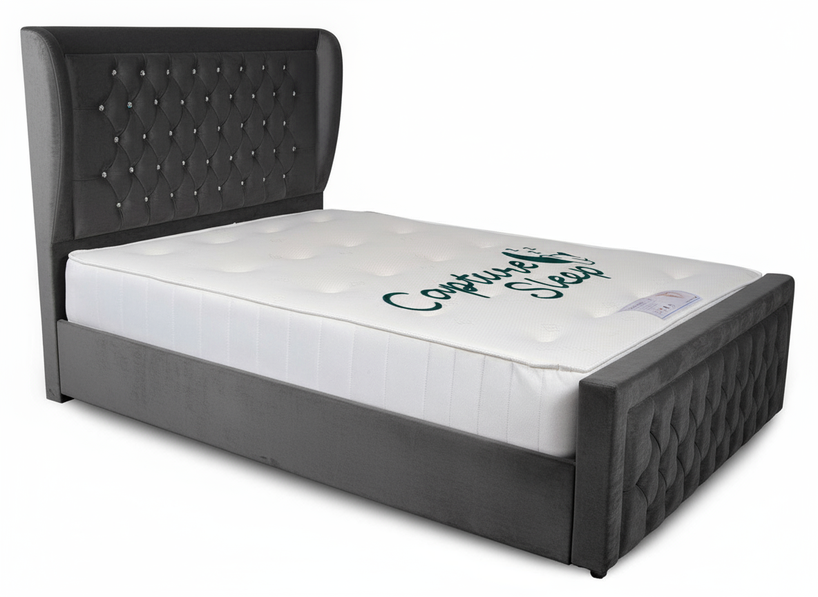 The Hilton Bed Frame features an elegant but simple design. The cushioned headboard creates comfort to match. Available in various fabrics and featuring a range of colour choices. Choose from matching Buttons or Diamantes.