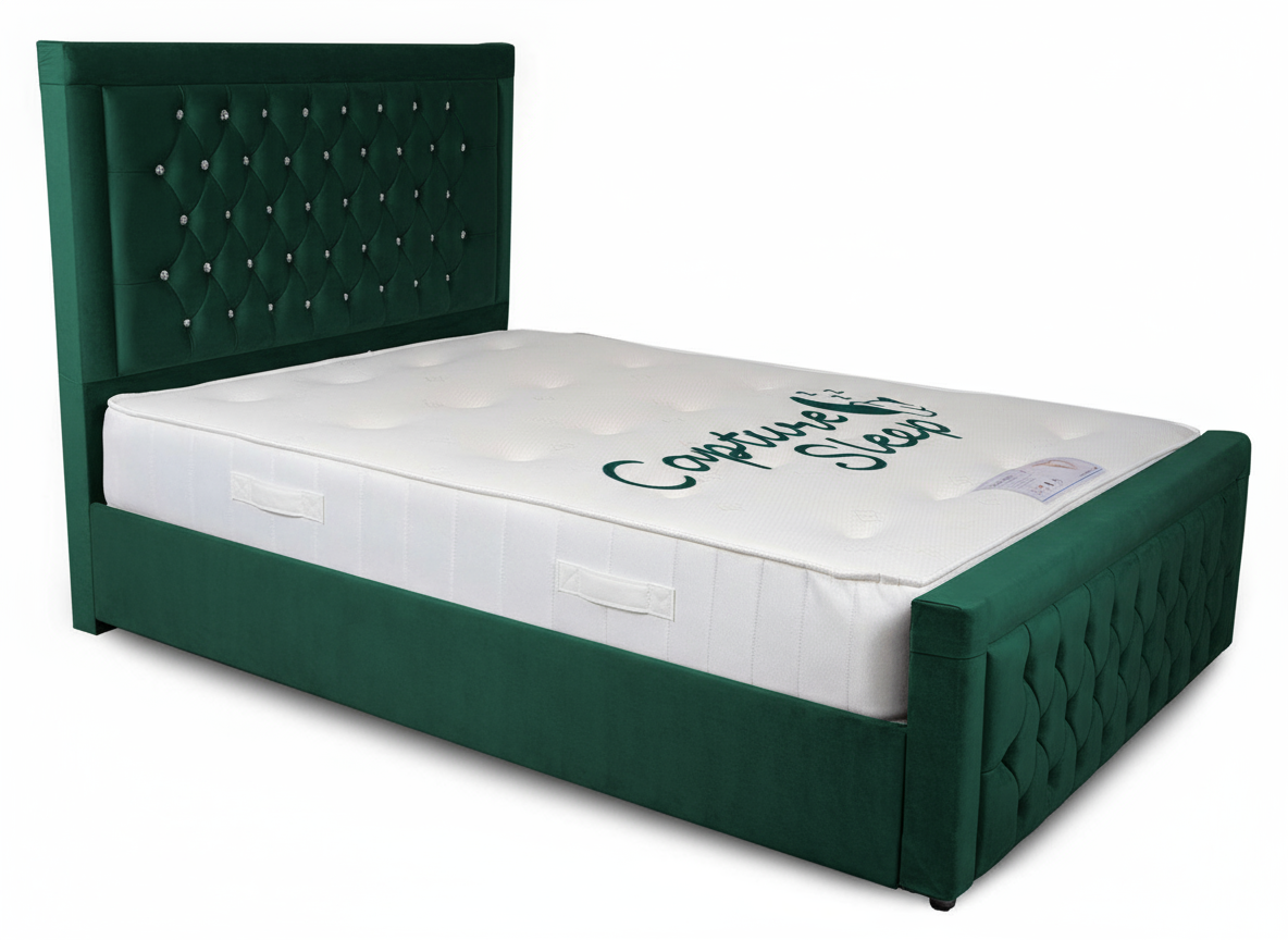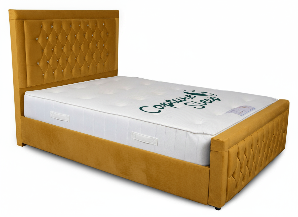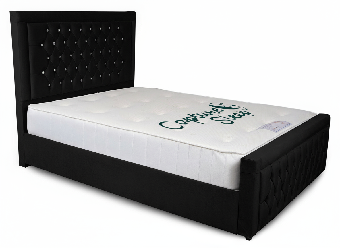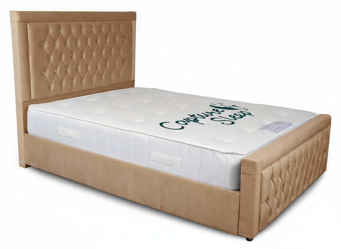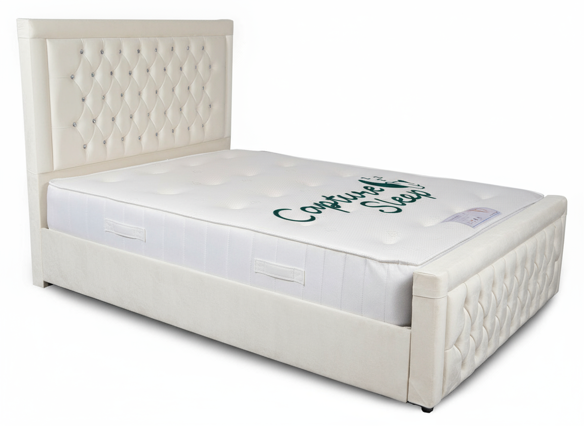 The Hilton Bed Frame features an elegant but simple design. The cushioned headboard creates comfort to match. Available in various fabrics and featuring a range of colour choices. Choose from matching Buttons or Diamantes.